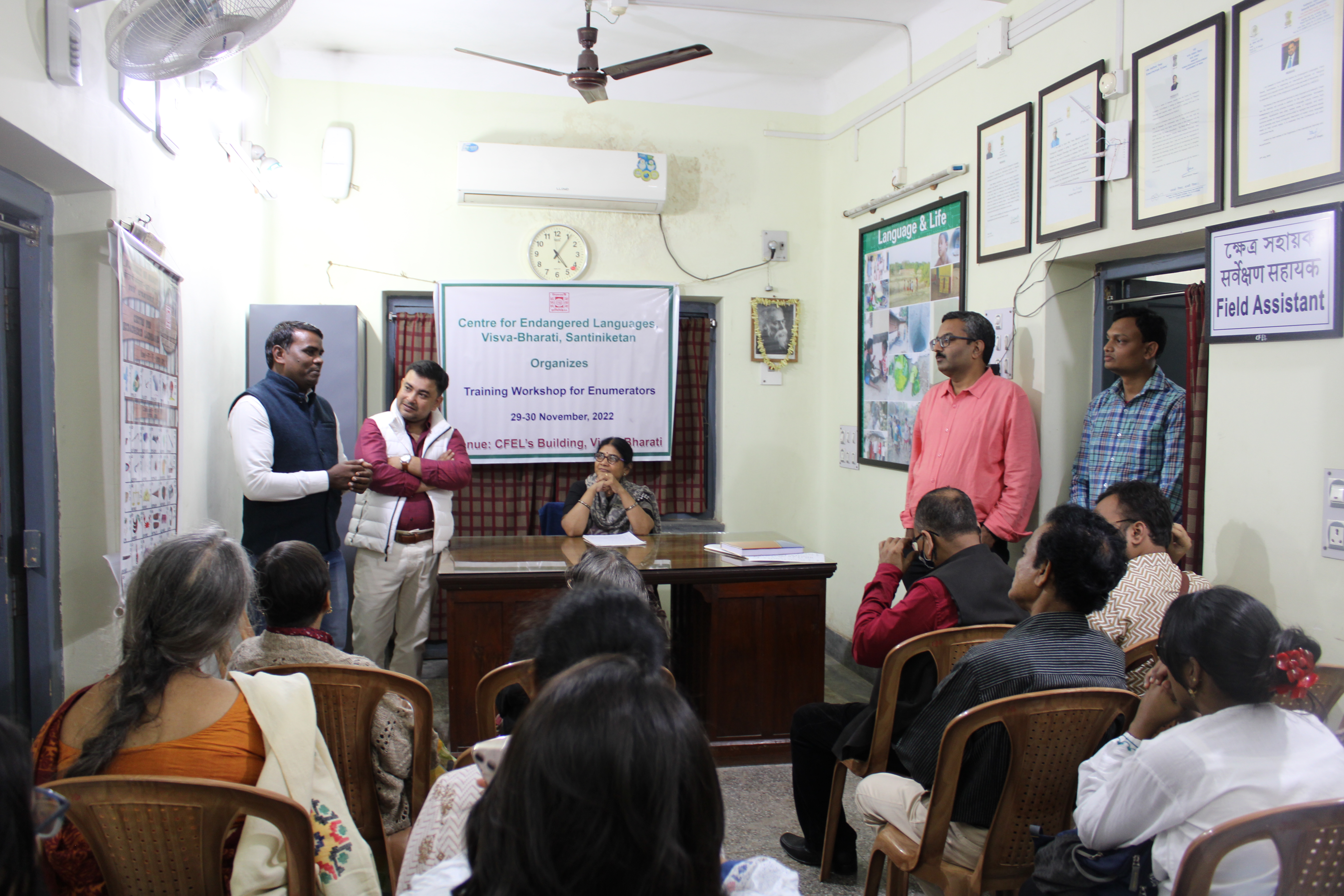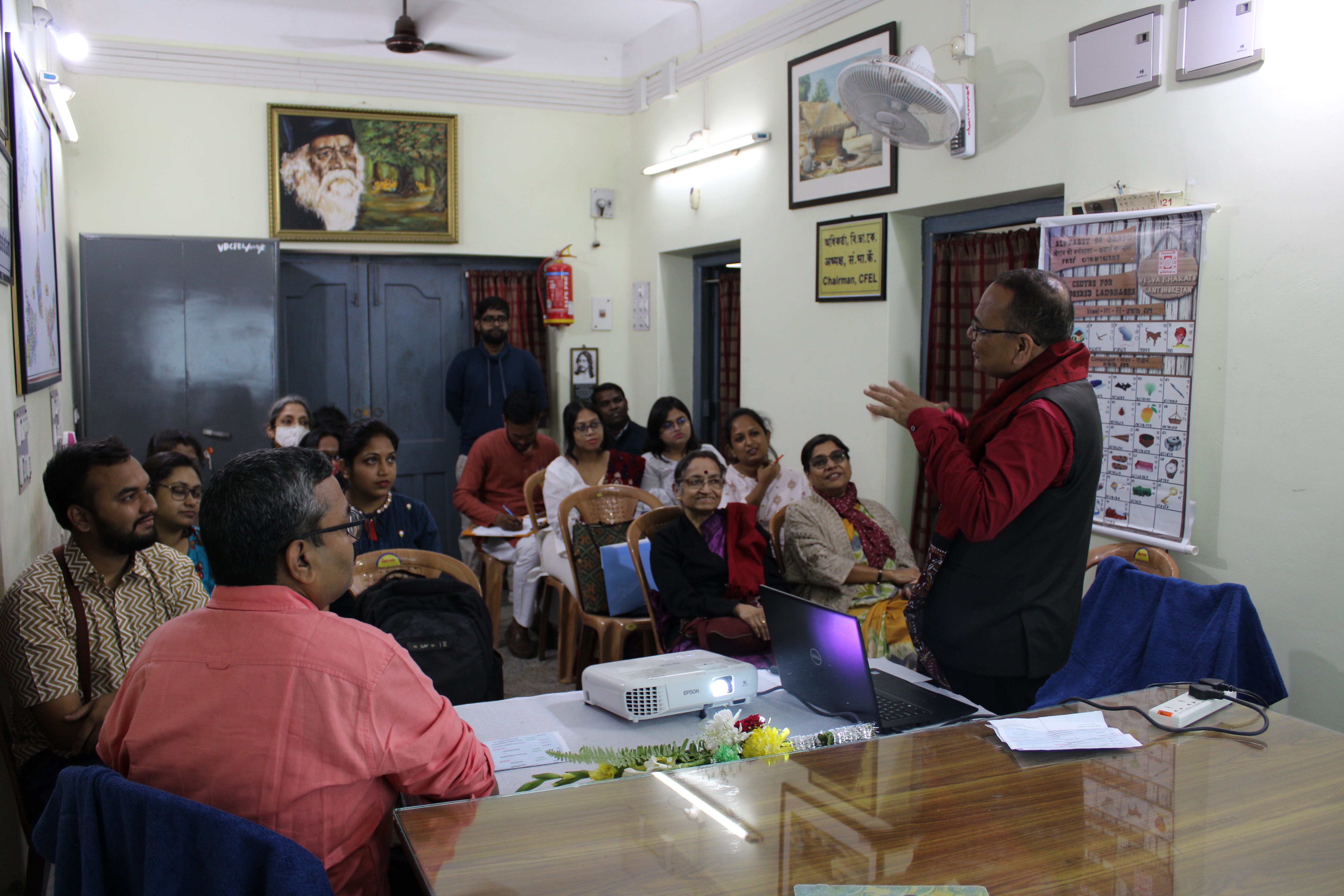 The first agenda was the registration and document verification of all participants, which started at 9:30 AM sharp and was finished by 10 AM. The Workshop was then brought to life by a welcome song performed by three students of Sangit Bhavana. Which was followed by an inaugural speech from honorable guest Prof. Mina Dan of Calcutta University and a presiding statement from CFEL Chairperson Prof. Sabita Pradhan, which ended the inaugural session by 10:45 AM. The academic session was kickstarted by honorable guest Dr. Milan Kanti Biswas of Visva-Bharati, Department of Bengali, through a lecture on the Folk Culture of West Bengal. Following this speech, a practical session was held for the participants which involved solving and explaining Linguistics related questions. The practical session was over by 1:30 PM and as per schedule a 40 mins lunch break was held. After the lunch break the second and final academic session of the day started at 2:00 PM. Honorable guest Retd. Prof. Krishna Bhattacharya gave a speech on the Study of Marginalized Languages, followed by a lecture on Anthropological Approaches to Ethnographic Studies: An Overview, by Honorable guest Dr. Arnab Ghosh of Visva-Bharati, Department of Anthropology. The academic session was successfully completed by 5:00 PM.
